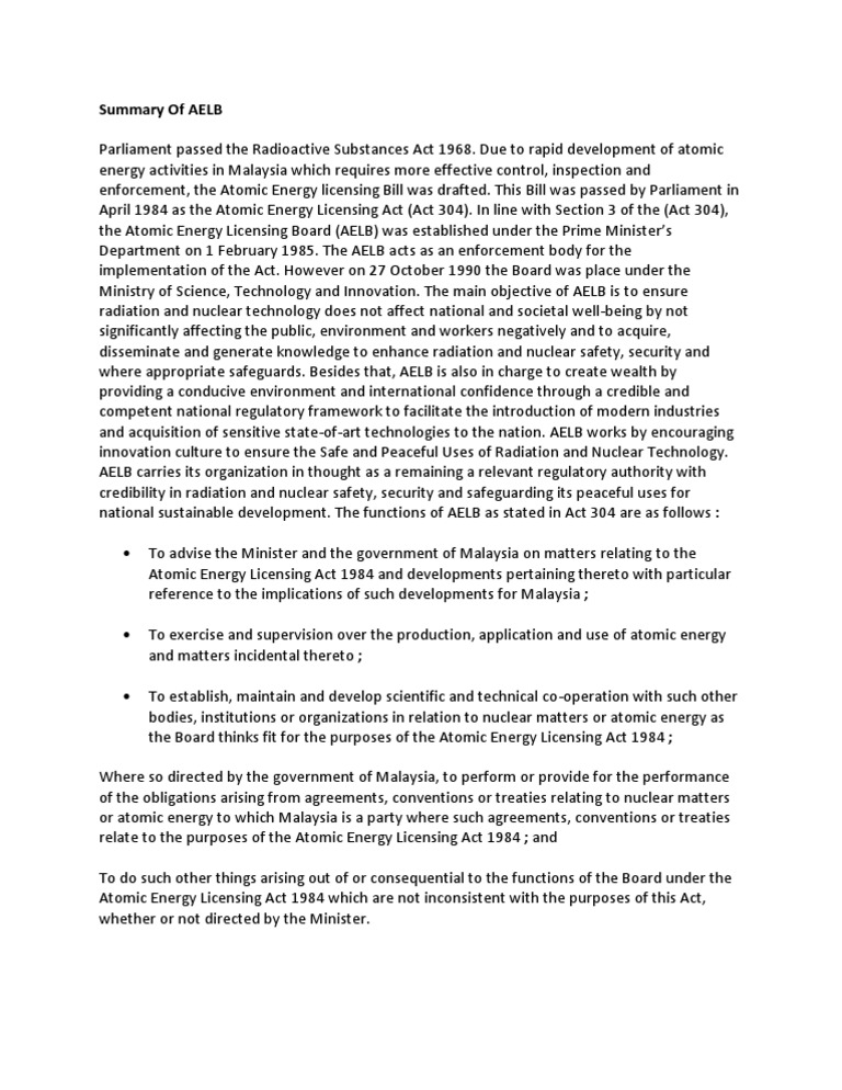¨ approach to facilitate licensing process for a site license ¨ siting criteria and guidelines ¨ selection and. We would like to know the level of public acceptance & understanding of the role and function of aelb and act 304 (atomic energy licensing act 1984). Guidelines to obtain class c licence under the atomic energy licensing act 1984 (act 304) from the ministry of health malaysia. Guidelines to obtain class c licence under the atomic energy licensing act (act 304) from the ministry of health. The board was placed under the purview of the prime minister's department (malay: