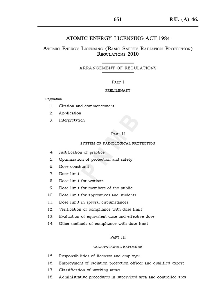 Laws Regulation On Chemicals Toxicity Personal Protective Equipment from imgv2-2-f.scribdassets.com Atomic energy act is a stock short title used for legislation in the united kingdom and the united states relating to nuclear power and, or alternatively, nuclear weapons production. The new act also established two new agencies such as the nuclear regulatory commission (nrc) and the energy research and development administration (erda). The new act abolished usaec. Atomic energy licensing board or in malay known as lembaga perlesenan tenaga atom (aelb) is a government agency under the ministry of science, technology & innovation (mosti). We would like to know the level of public acceptance & understanding of the role and function of aelb and act 304 (atomic energy licensing act 1984). Short title, commencement and application 2. An act to provide for the regulation and control of atomic energy, for the establishment of standards on liability for nuclear damage and for matters connected therewith or related thereto. The board was placed under the purview of the prime minister's department (malay: