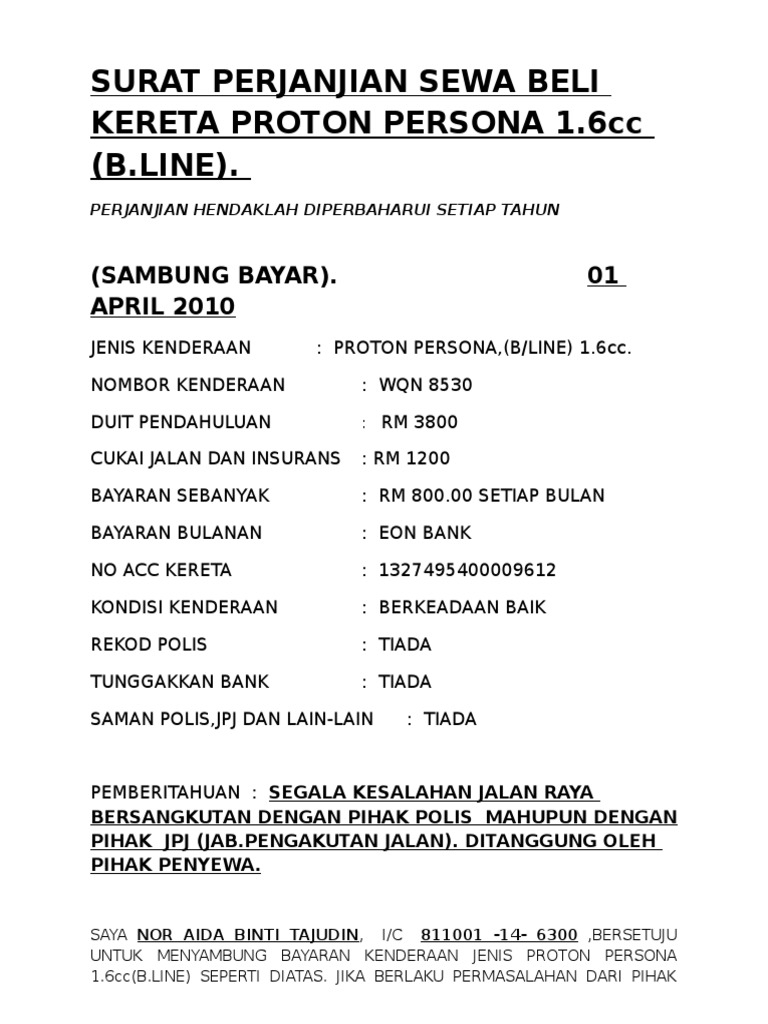 Contoh Perjanjian Jual Beli Kereta - Contoh :perjanjian jual beli pada hari ini senin tanggal 1 mei 2010 terjadi kesepakatan jual beli oleh :. Surat perjanjian jual beli berisi materi yang ditanda tangani oleh pembeli dan penjual. Salah satu contohnya adalah pada transaksi jual beli tanah. Savesave contoh surat perjanjian jual beli kereta for. (kemudian daripada ini disebut sebagai penjual) di satu pihak dengan __ no.k/p ___ beralamat di __ (kemudian daripada ini disebut 2) penjual bersetuju untuk membuat pindah milik dalam geran berdaftar bagi kereta no. Download as docx, pdf, txt or read online from scribd.