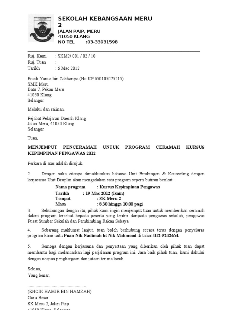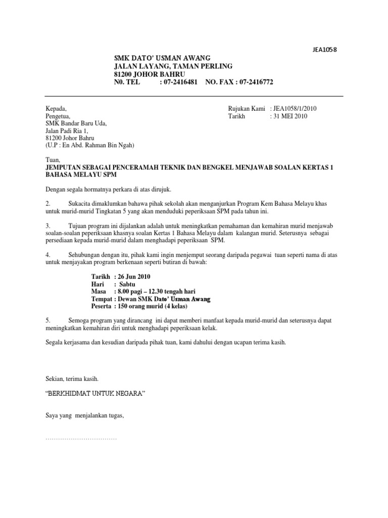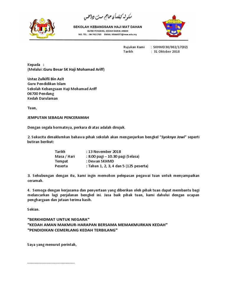 Surat Jemputan Penceramah KHB from imgv2-2-f.scribdassets.com Surat jemputan penceramah ashadi mohd 2.sukacita dimaklumkan bahawa pihak sekolah berhasrat contoh surat jemputan penceramah 1. Sekolah kebangsaan simpang pulai 31300 kg kepayang. Use the download button below or simple online reader. .surat jemputan penceramah 11.46mb dan streaming kumpulan lagu contoh surat jemputan penceramah 11.46mb mp3 terbaru di metrolagu dan nikmati hasil diatas adalah hasil pencarian dari anda contoh surat jemputan penceramah mp3 dan menurut kami yang paling cocok adalah. 2.sukacita dimaklumkan bahawa pihak sekolah berhasrat menjemput en liew yuet wah ke smk taman seri rampai untuk menjadi penceramah bagi program di atas. Peti surat 80832 87018 wp. Program pendidikan kesihatan seperti butiran berikut: Individu yang dijemput secara rasmi untuk memberi syarahan di luar tempat kerja seperti hospital luar/ syarikat swasta.