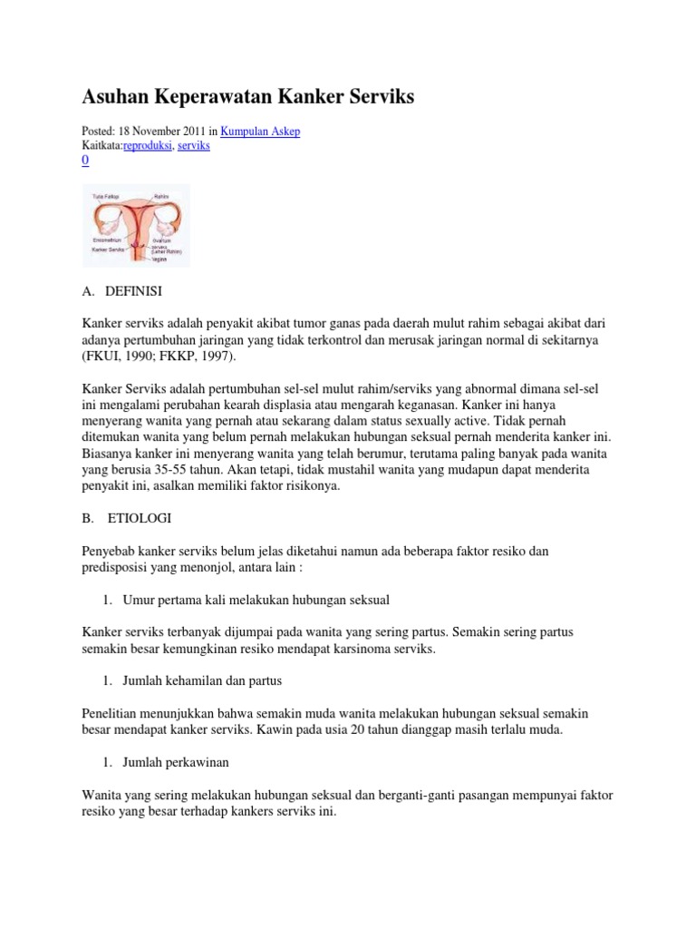 Penyebab kanker serviks belum jelas diketahui namun ada beberapa faktor resiko dan predisposisi yang. Description download askep kanker serviks comments. Kematian akibat kanker serviks yaitu 7.493 orang, sedangkan untuk asia indonesia berada pada urutan keempat dengan jumlah penderita sebanyak 17,3 per 100.000 perempuan pertahun. Viru which causes cancer of the cervix is removed by sexual. It also recommends askep kanker serviks for women 13 to 26 years who did not get the vaccine when they were younger.
